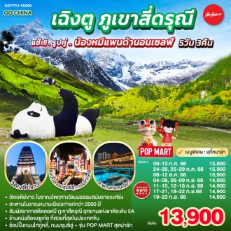 กรุงเทพฯ(สนามบินดอนเมือง) – สนามบินเฉิงตูเทียนฟู่ - วัดเจดีย์ขาว – เมืองตูเจียงเยี่ยน – จตุรัสหยางเทียนหวู่ – รูปปั้นหมีแพนด้านอนเซลฟี่ – ร้านหนังสือจงซูเก๋อ – ร้านยาสมุนไพรจีน – สะพานโบราณหนานเฉียว(Blue Tears) - อุทยานสี่ดรุณี เส้นทางหุบเขาซวงเฉียวโกว (รวมรถอุทยาน) – เมืองเฉิงตู - ร้านหมอนโอโซน – ศูนย์ผลิตภัณฑ์ผ้าไหม - ถนนคนเดินชุนซีลู่ – หมีแพนด้ายักษ์ปีนตึก IFS + ร้าน POP MART – ถนนไท่กู่หลี่ - สนามบินเฉิงตู -กรุงเทพฯ (สนามบินดอนเมือง)